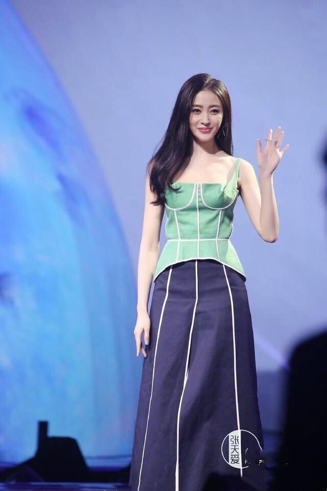 張天愛經常出席各種活動,見慣了大場面造型上她也有出錯的時候,上身一件綠色白道的弔帶衫看起來挺有活力的,寬大的領子有點法式方領的感覺,秀出了性感的鎖骨十分迷人。下裝搭配的依舊是深藍色白道的半身裙,這樣輕熟的打扮很符合她的氣質,卻也出現了小尷尬。